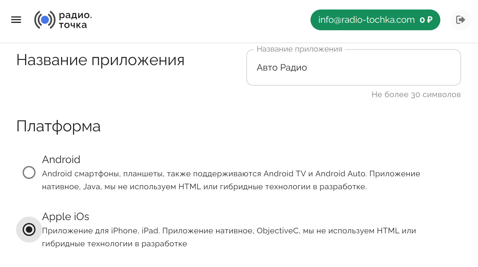 - Минимальное техническое сопровождение, в базовой версии Вам достаточно заполнить форму создания приложения (указать название, описание, логотипы и потоки радио)