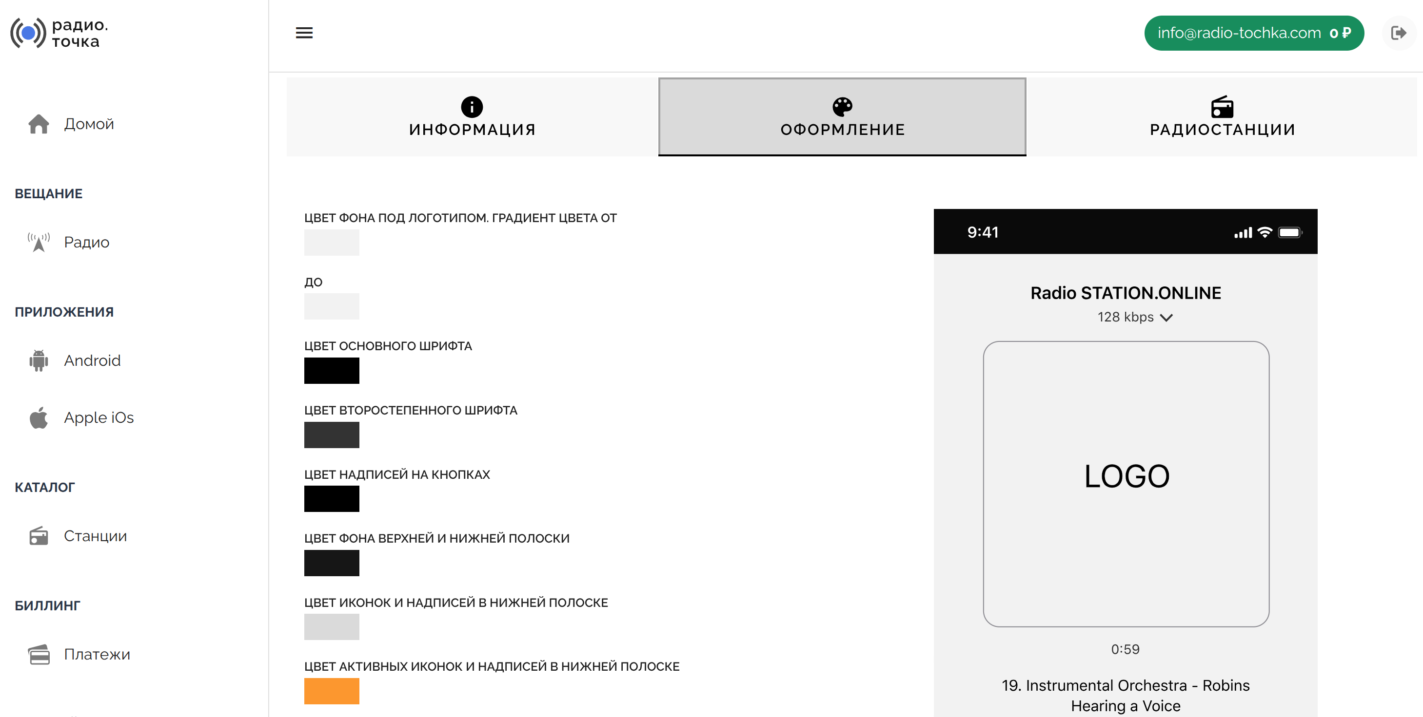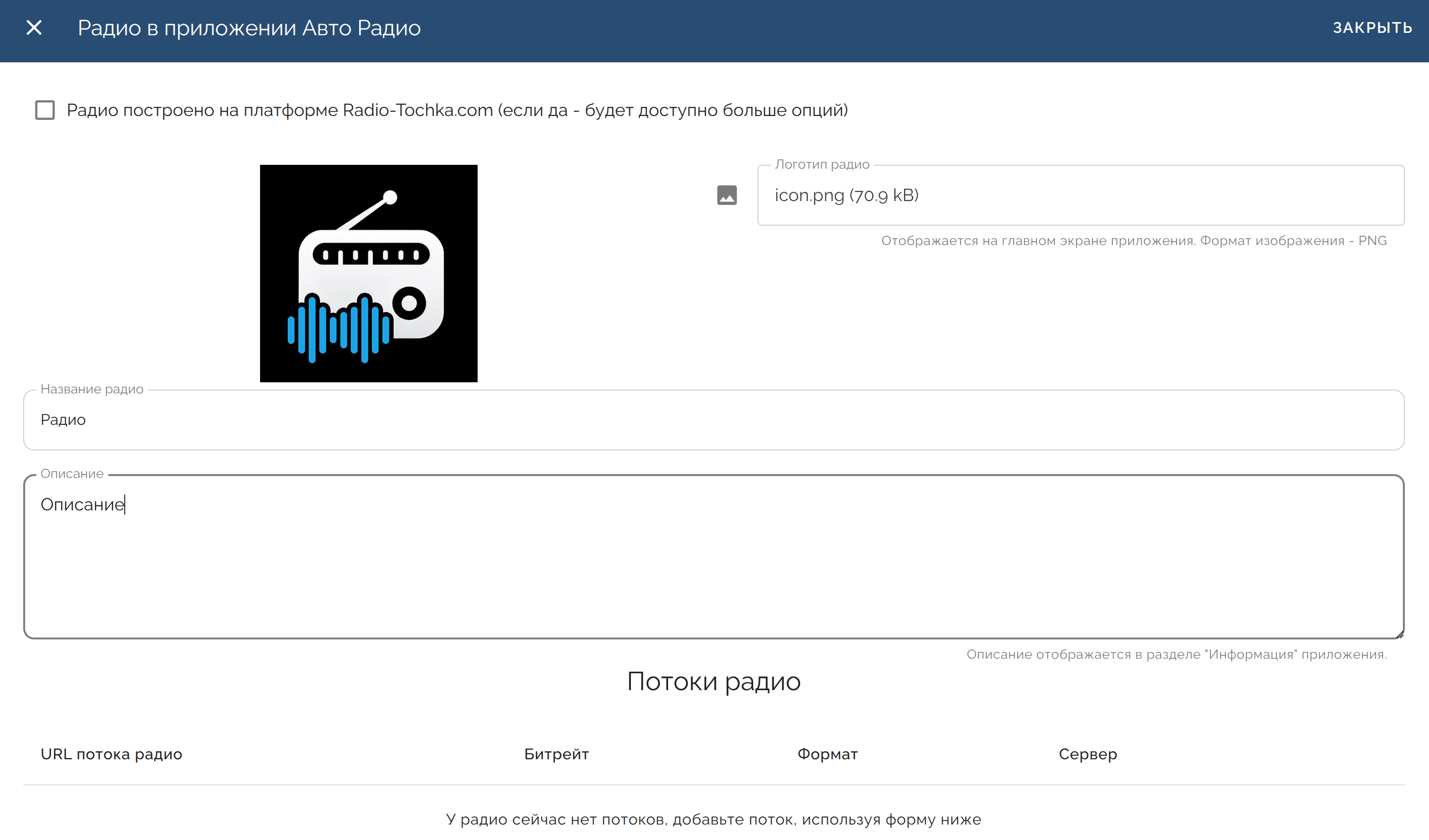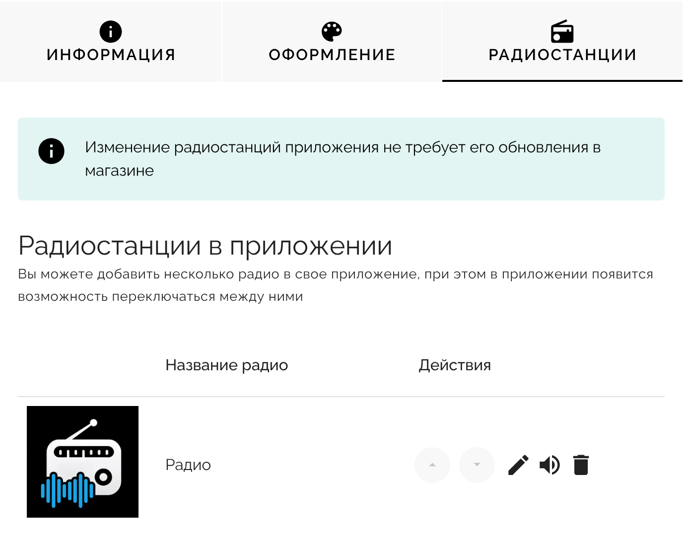 У каждой станции в приложении может быть свой собственный логотип, потоки радио, ссылки на соц. сети и текст для раздела “Инфо” в приложении.