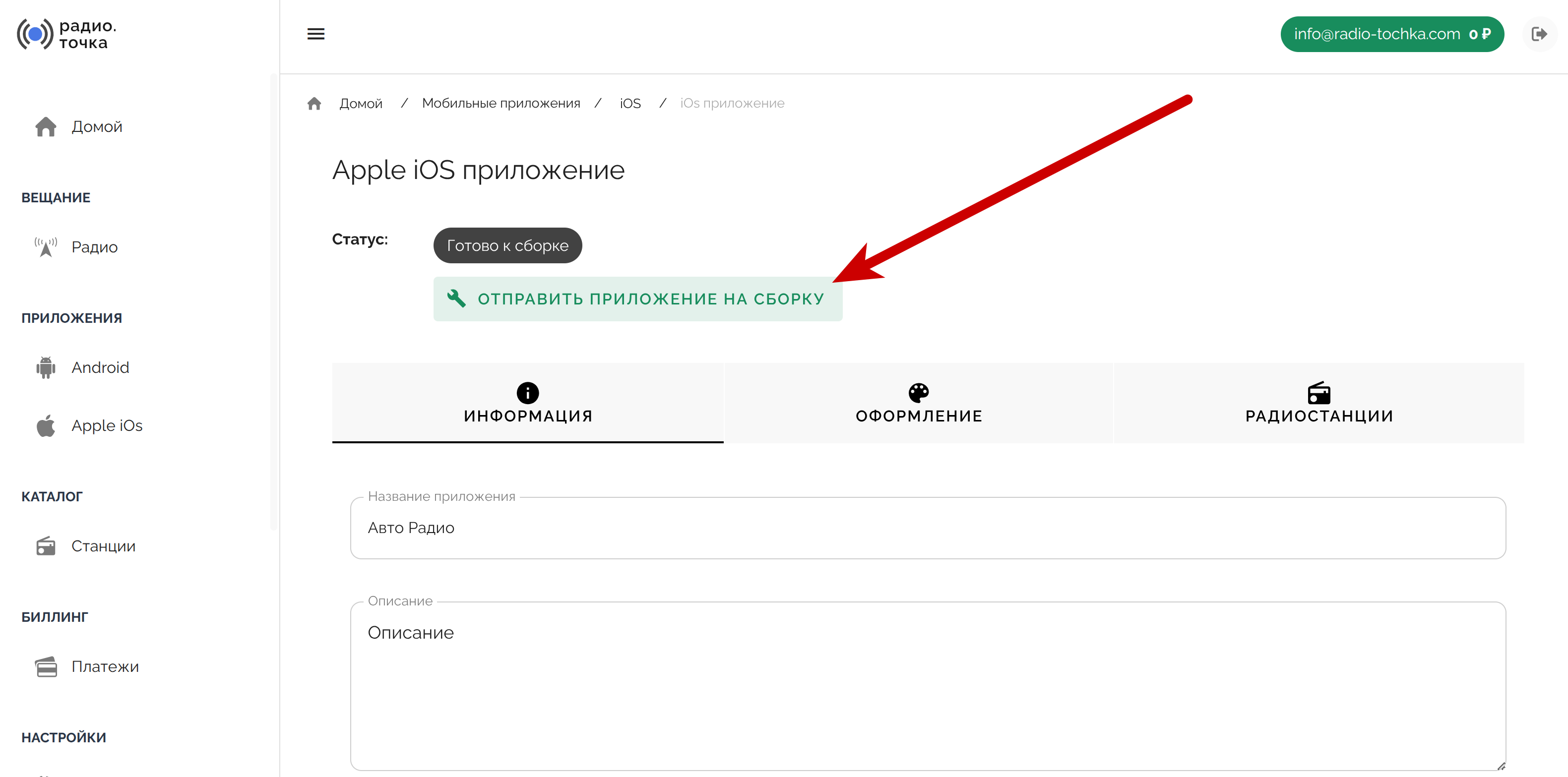 Когда вся информация заполнена корректно - отправьте приложение на сборку, используя соответствующую кнопку в верхнем меню, наш специалист скомпилирует приложение и мы сможем отправить Вам скриншоты.