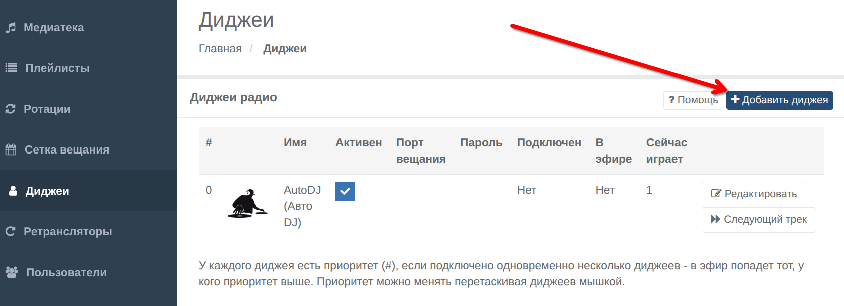 Откройте панель управления радио и перейдите в раздел «Диджеи».