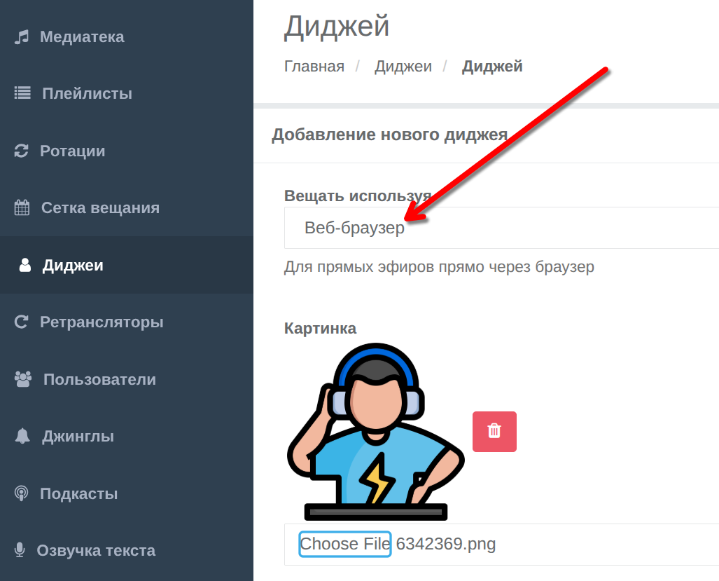 При создании диджея в поле «Вещать используя» выберите вариант «Веб-браузер».