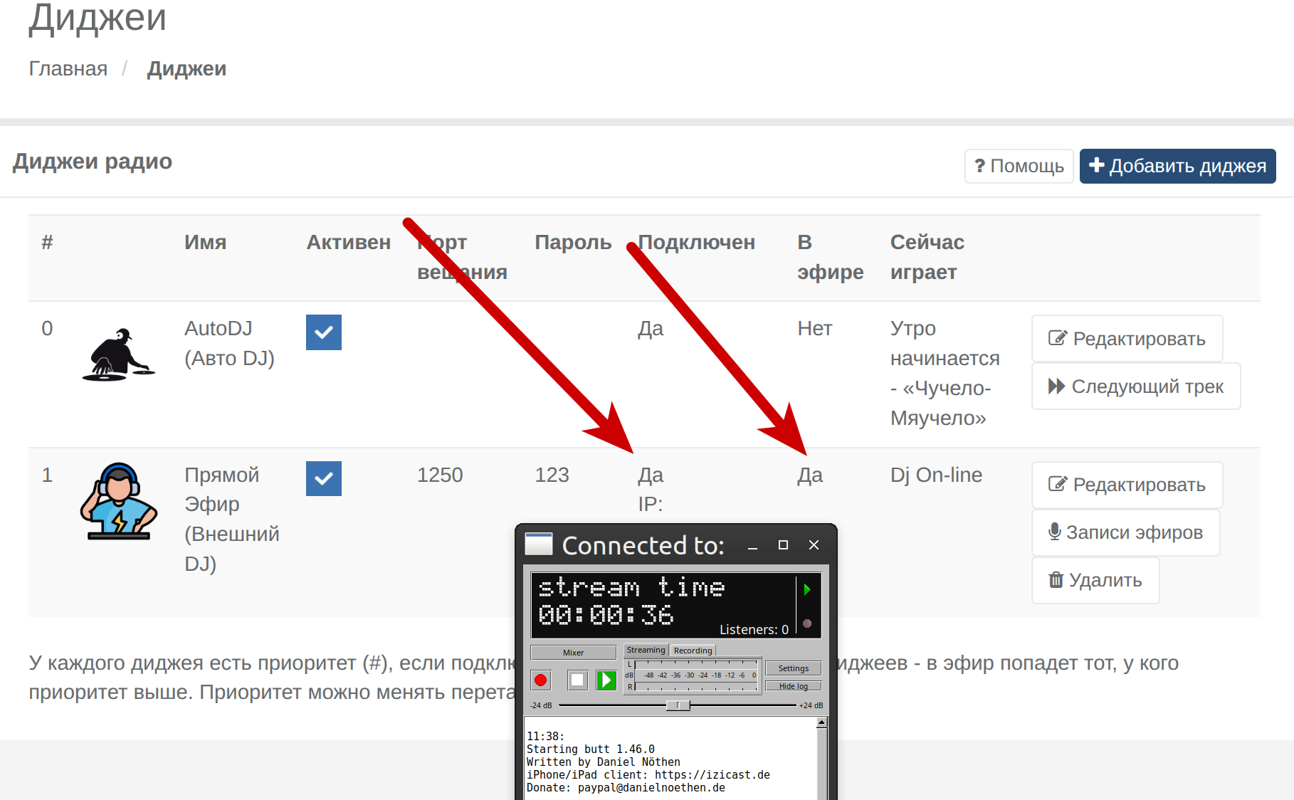 Сначала статус DJ изменится на «Подключен: Да», а после небольшой буферизации стрима значение «В эфире» также станет «Да». Это означает, что DJ успешно подключён и ведёт live-вещание.