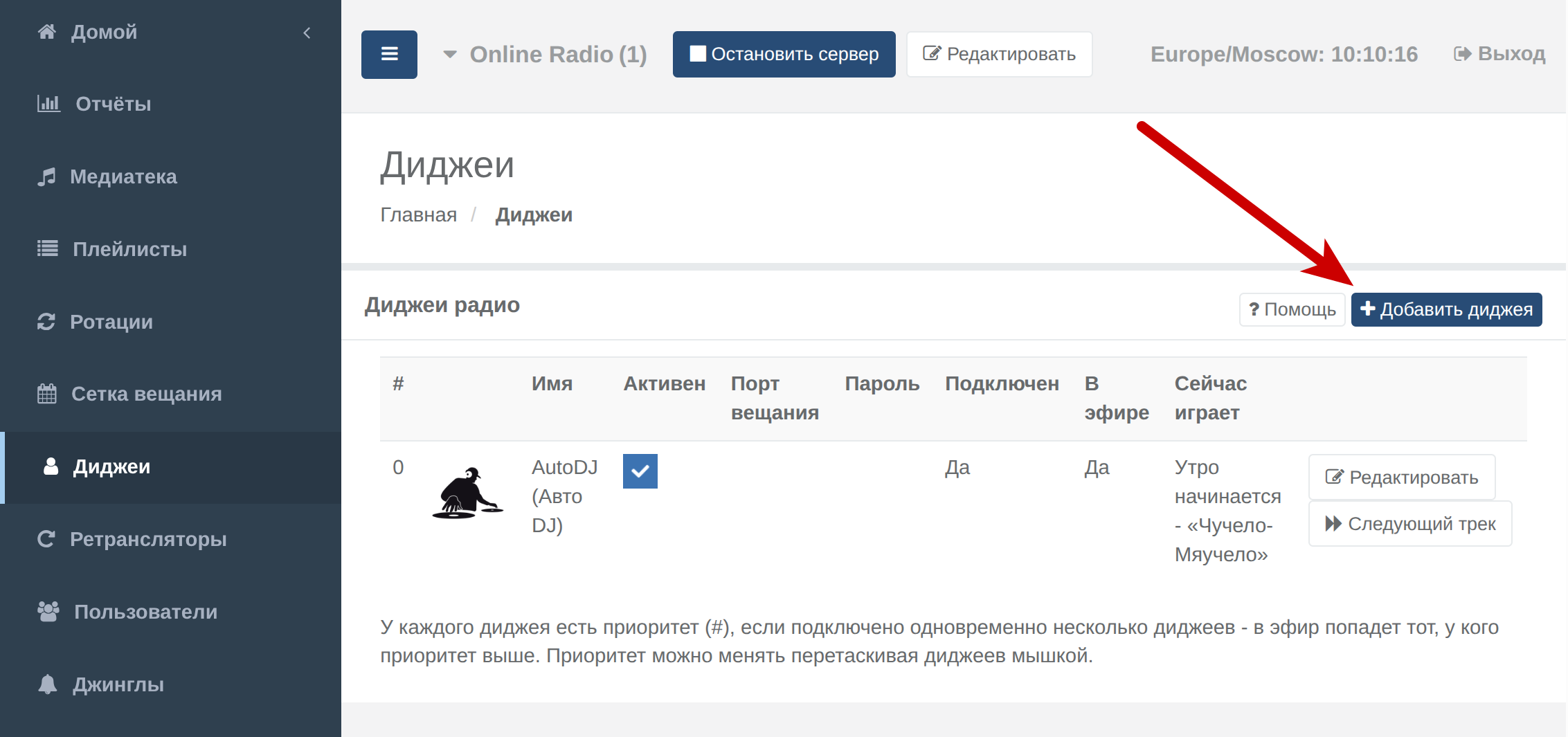 Войдите в интерфейс панели управления Radio-Tochka и перейдите в раздел «Диджеи». По умолчанию в этом разделе присутствует только AutoDJ, который используется для автоматического воспроизведения.