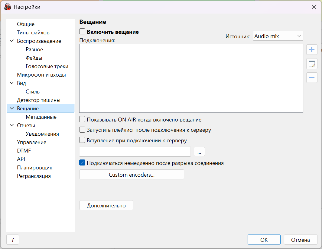 При необходимости, снова откройте Вещание в RadioBoss и для нужного энкодера можно задать параметры кодирования, такие как формат, частота и битрейт.