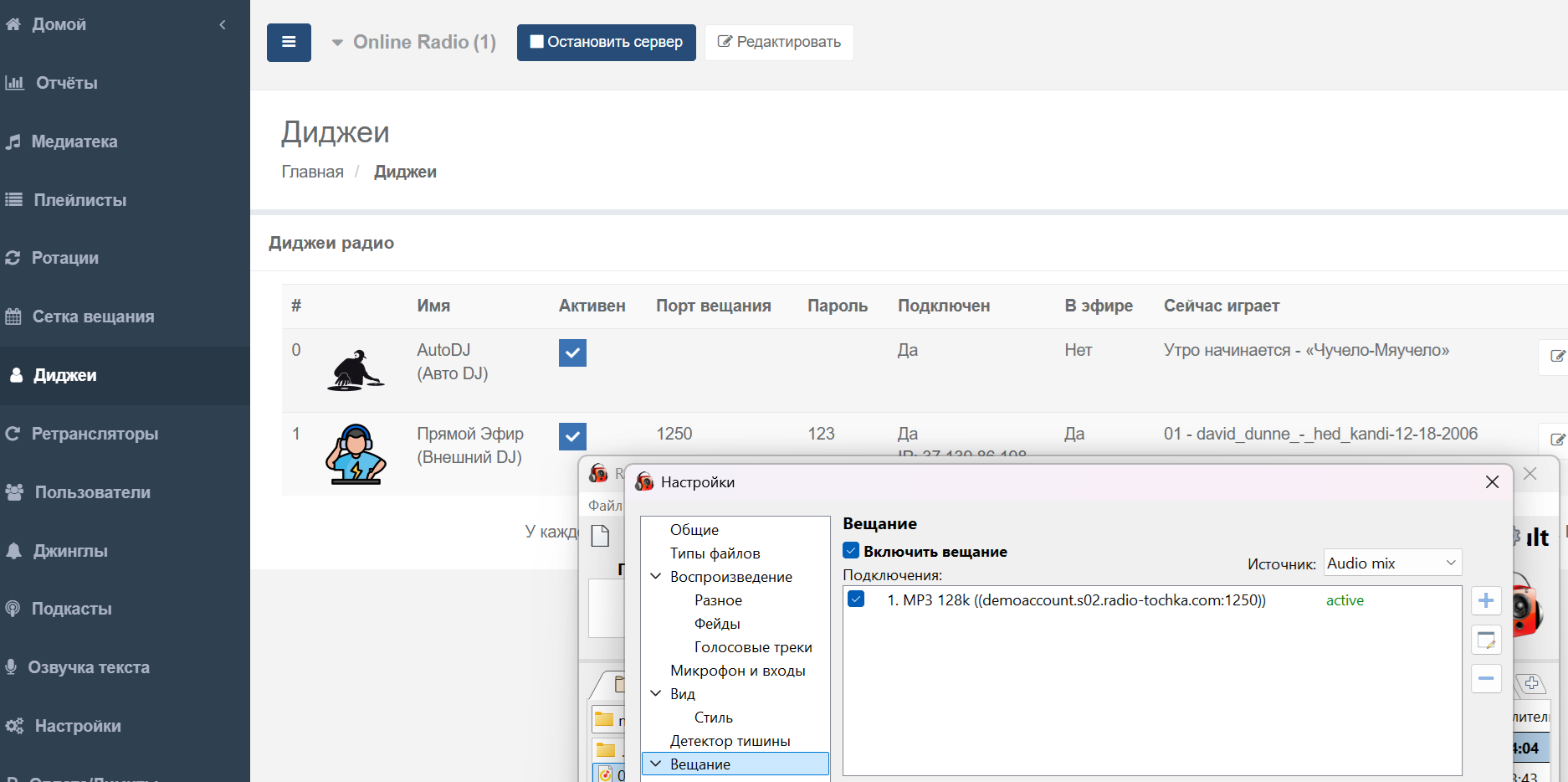 demo.radio-tochka.com) безhttp://илиhttps://, далее двоеточие и номер порта из панели управления, например, в нашем примере получается:s02.radio-tochka.com:1250 - Пароль — порт из раздела Параметры подключения панели управления радио