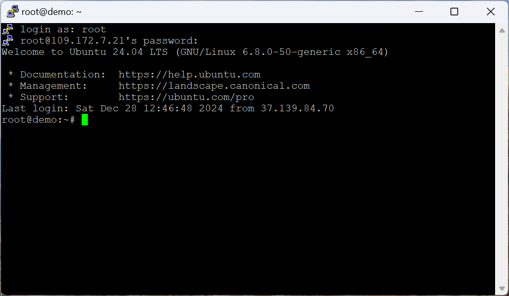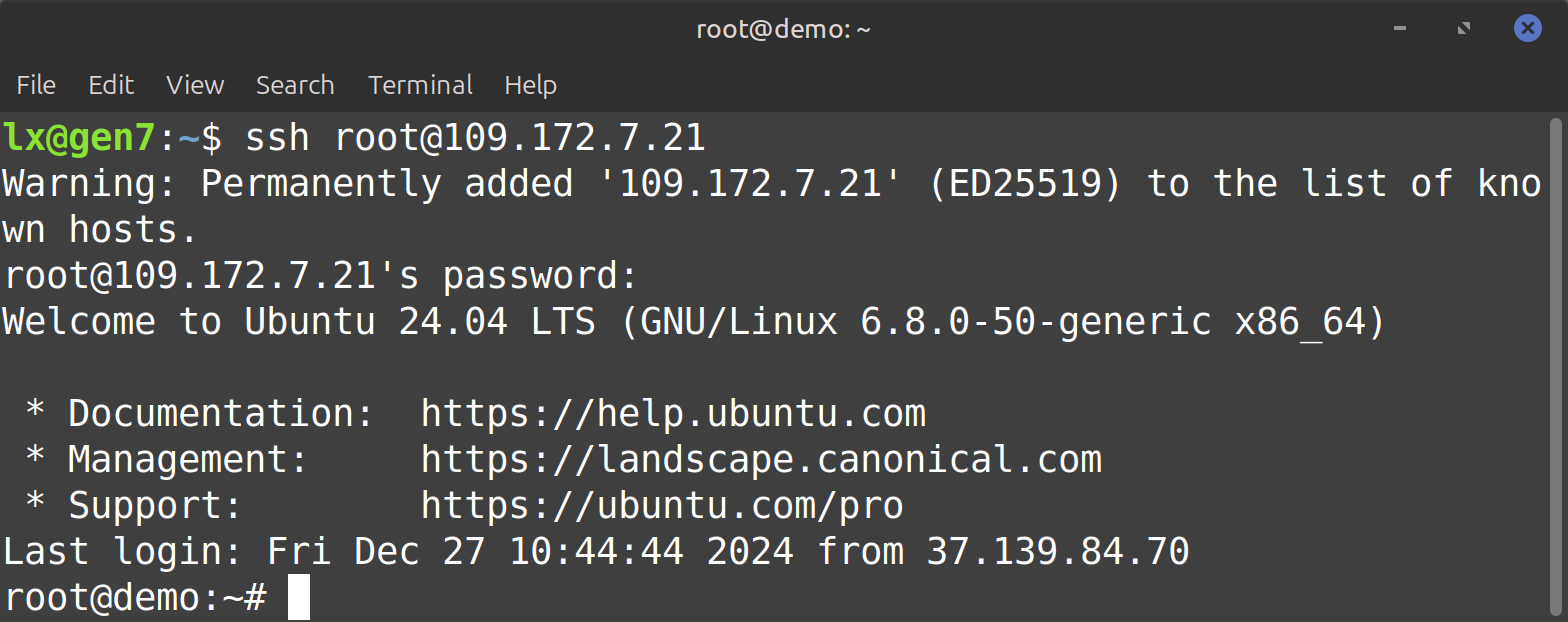 Для подключения к серверу выполняем в терминале ssh root@ip-адрес-сервера и вводим пароль
