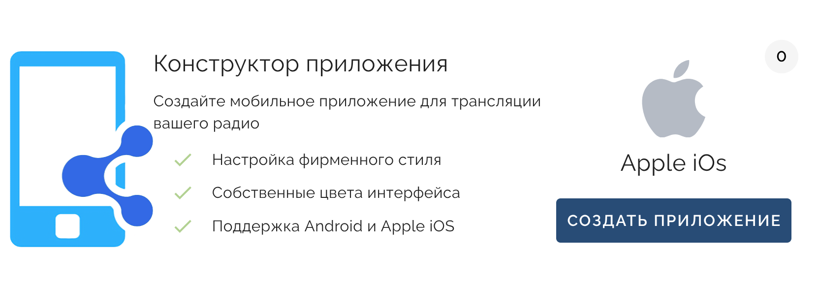- Минимальное техническое сопровождение, в базовой версии Вам достаточно заполнить форму создания приложения (указать название, описание, логотипы и потоки радио)