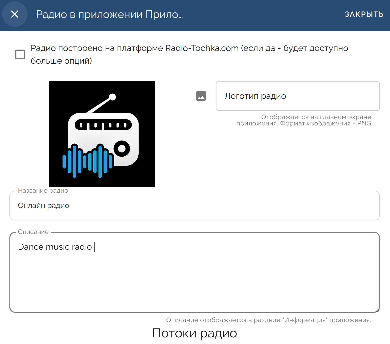 У каждой станции в приложении может быть свой собственный логотип, потоки радио, ссылки на соц. сети и текст для раздела “Инфо” в приложении.