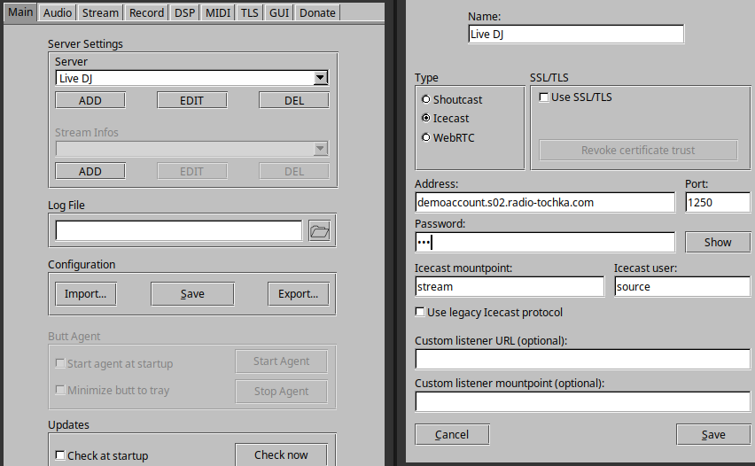 Настройка сервера в BUTT