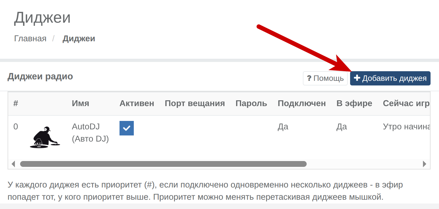 Войдите в интерфейс вещателя Radio-Tochka и перейдите в раздел «Диджеи». По умолчанию в этом разделе присутствует только AutoDJ, который используется для автоматического воспроизведения.