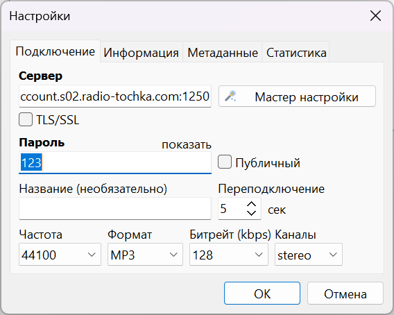 demo.radio-tochka.com) безhttp://илиhttps://, далее двоеточие и номер порта из панели управления, например, в нашем примере получается:s02.radio-tochka.com:1250 - Пароль — порт из раздела Параметры подключения панели управления радио