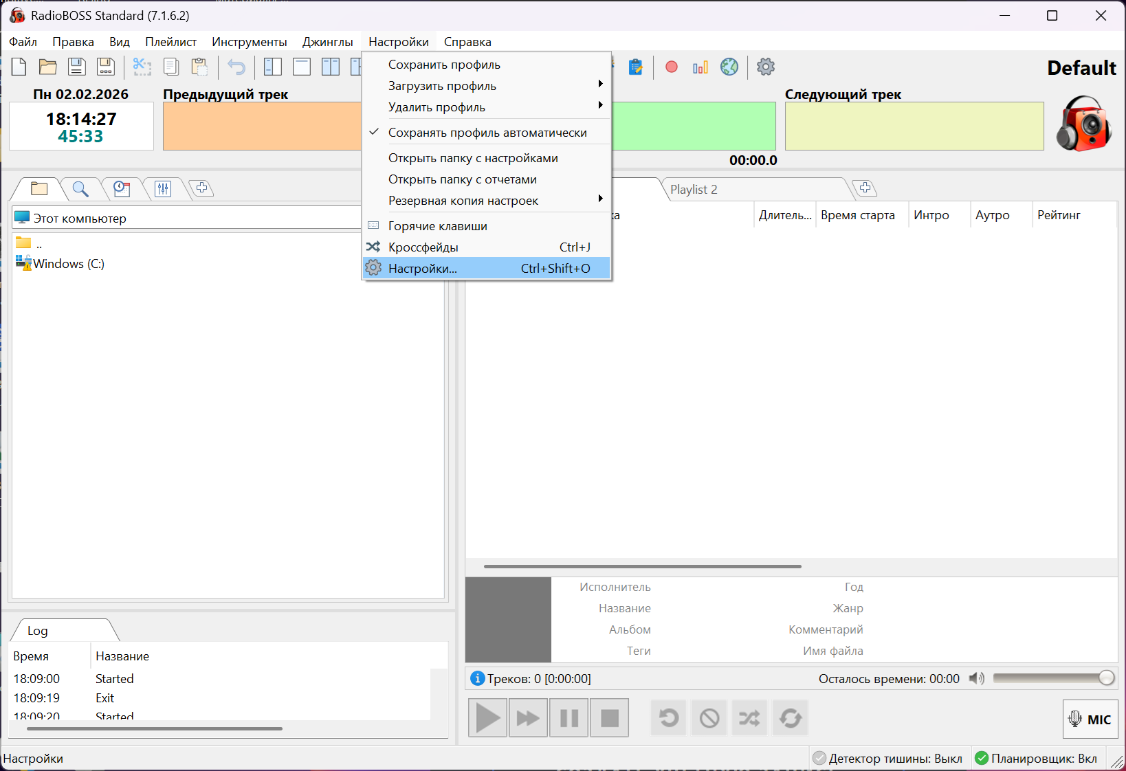 Откройте RadioBOSS и через верхнее меню перейдите в меню Настройки: