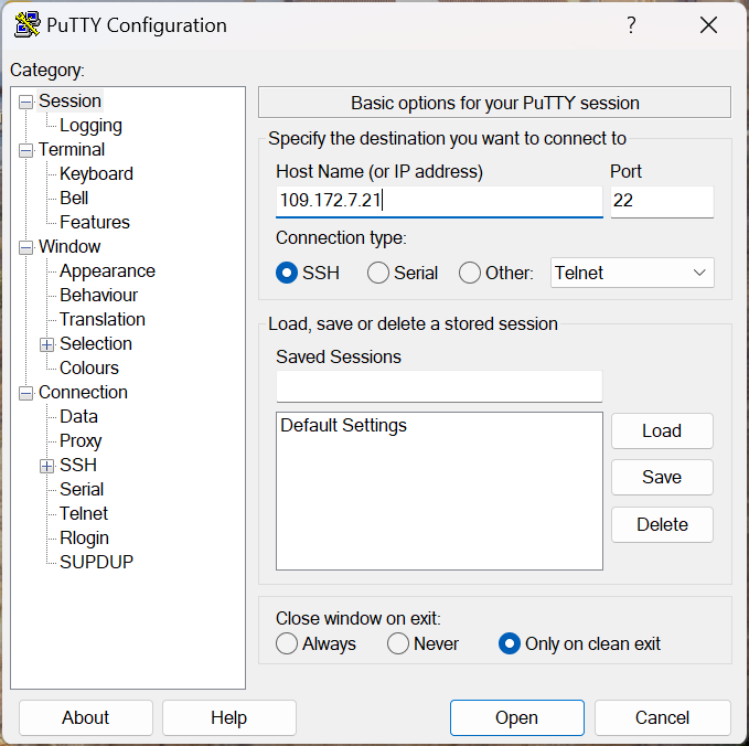 После установки Putty на главном экране необходимо ввести IP адрес сервера